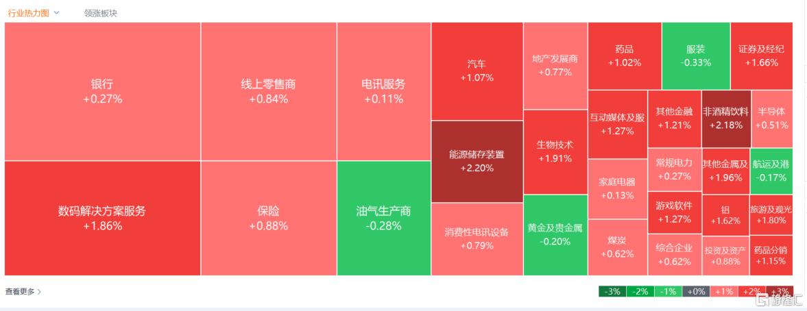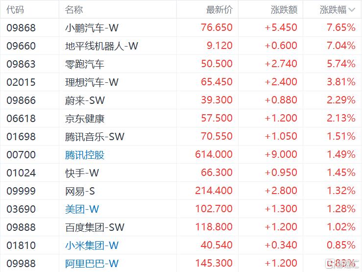 大型科技股集体上涨,腾讯控股涨1.49%,快手涨1.45%,网易涨1.32%,美团涨1.28%,百度涨1.02%。