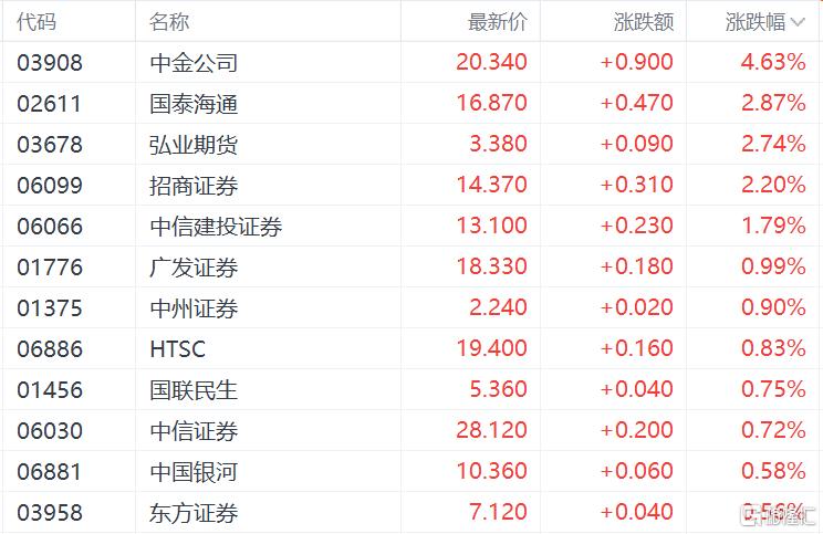 中资券商股上扬,中金公司涨超4%,国泰海通、弘业期货、招商证券涨超2%,中信建投证券、广发证券、中信证券跟涨。