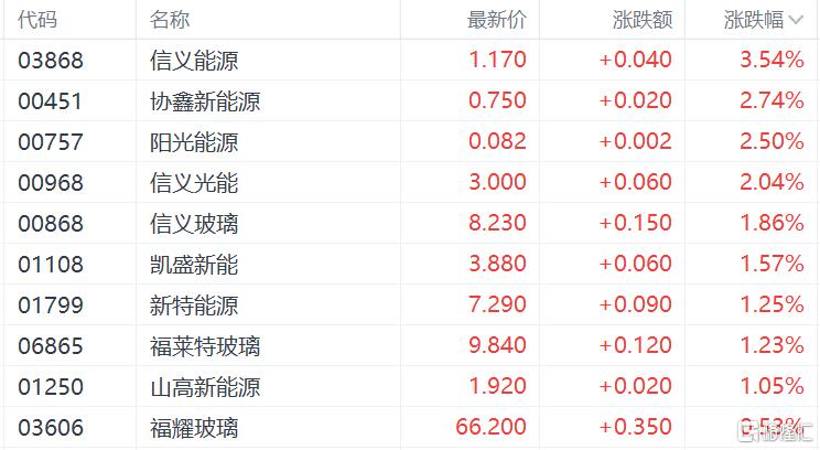 光伏及太阳能股齐涨,信义能源涨超3%,协鑫新能源、阳光能源、信义光能涨超2%,信义玻璃、凯盛新能、新特能源、福莱特玻璃涨超1%。