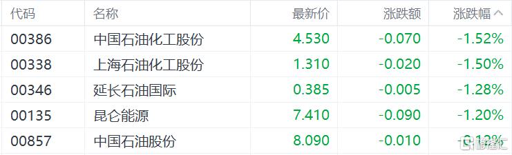 石油股下跌,中国石油化工股份、上海石油化工股份、延长石油国际、昆仑能源跌超1%。