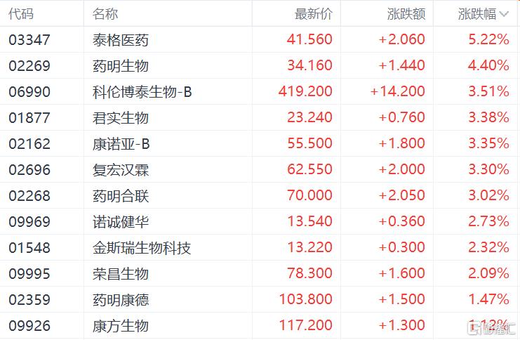 生物医药股活跃,泰格医药涨5.22%,药明生物涨4.4%,科伦博泰生物-B、君实生物、复宏汉霖、药明合联涨超3%,诺诚健华、金斯瑞生物科技、药明康德、康方生物纷纷上涨。兴业证券认为,当前板块景气度可持续,“创新+国际化”创新药产业趋势不变,短期调整后创新药板块弹性进一步提升。同时,可继续重点关注基本面已开始改善的创新药产业链,当前在投融资数据、订单和业绩层面均看到向好趋势。