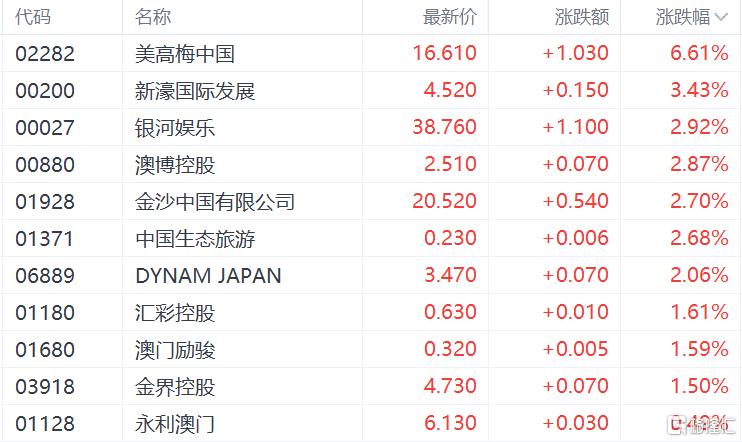 博彩股普涨,美高梅中国涨超6%,新濠国际发展涨超3%,银河娱乐、澳博控股、金沙中国涨超2%。
