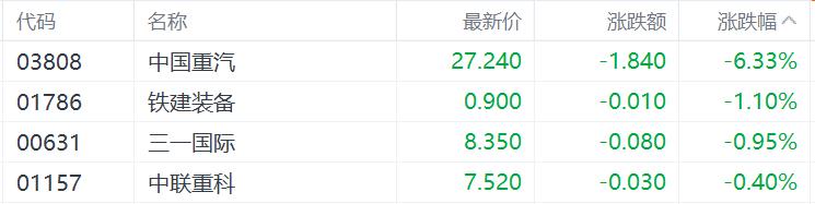 重型机械股部分下跌,中国重汽跌超6%,铁建装备跌1.1%。