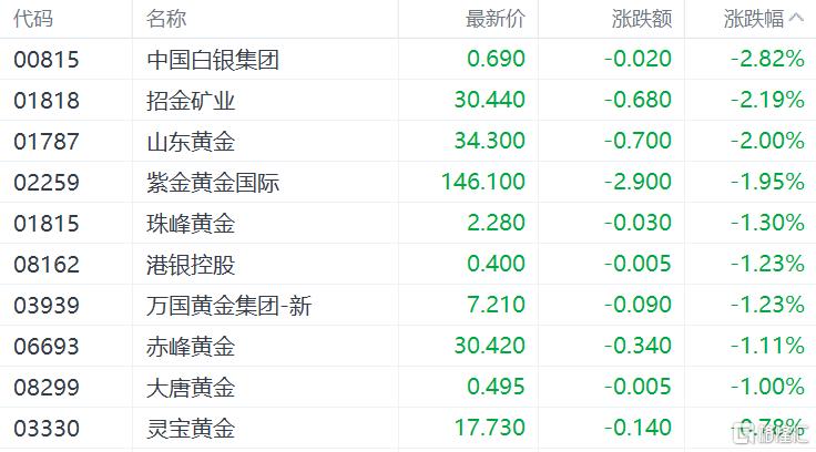 金银价格走低,黄金及贵金属板块集体弱势,中国白银集团、招金矿业、山东黄金跌超2%,紫金黄金国际、珠峰黄金、赤峰黄金跌超1%。