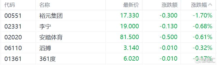 体育用品股部分表现低迷,裕元集团跌1.7%,李宁、安踏体育、361度跟跌。