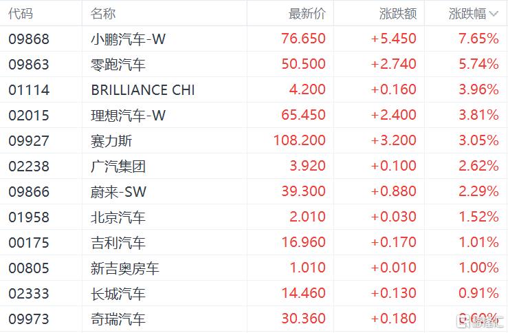 汽车股尾盘持续拉升,小鹏汽车涨7.65%,零跑汽车涨5.74%,理想汽车、赛力斯涨超3%,广汽集团、蔚来涨超2%。