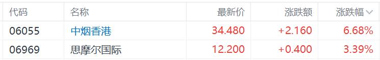 电子烟概念股涨幅靠前,中烟香港涨6.68%,思摩尔国际涨3.39%。消息面上,国办印发《关于全链条打击涉烟违法活动的意见》,全方位加强电子烟监管,严厉查处非法生产、批发、运输、销售电子烟和电子烟出口回流等违法活动。招商证券研报指出,烟草板块持续看好港股思摩尔国际及中烟香港。