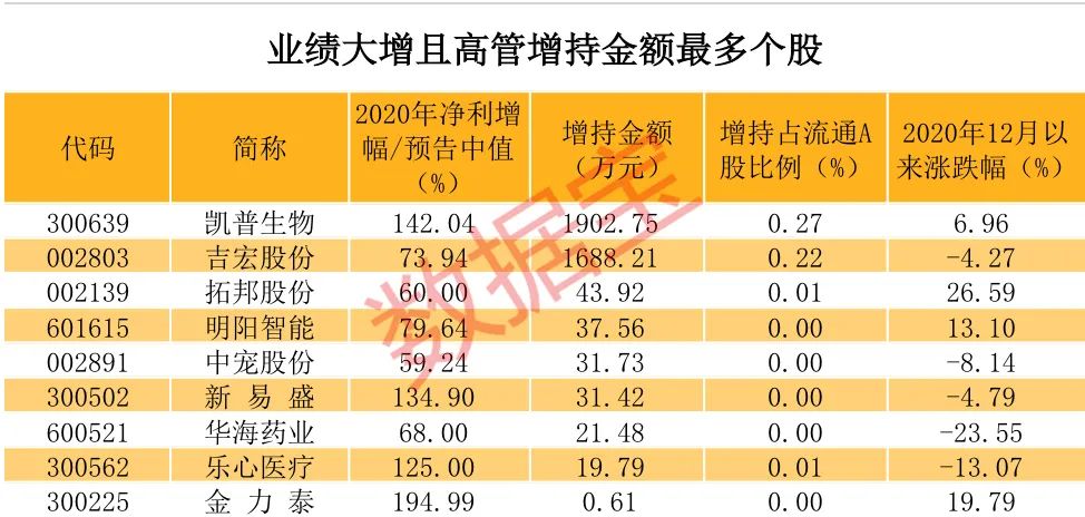业绩大增个股不但受到机构席位、上市公司股东的青睐,连高管也来凑热闹。在1031只年度业绩增长超过50%的个股中,自2020年12月1日至2021年1月31日期间高管增持的共有9只,增持股数达0.01亿股,增持金额达0.38亿元。