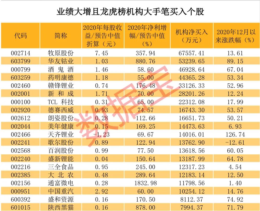 在1031只2020年大幅增长(增幅在五成及以上)的个股中,自2020年12月1日至2021年1月31日期间机构净买入的共有88只,其中净买入金额最大的个股有:牧原股份年度净利润增长357.94%,机构净买入6.76亿元;华友钴业净利润增长880.76%,龙虎榜机构资金净流入5.32亿元;酒鬼酒业绩同比增长58.6%,机构净买入4.69亿元。