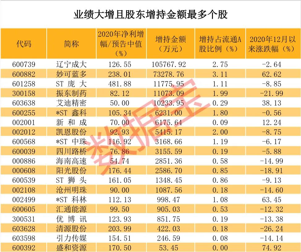 业绩大增个股不但受到机构席位的青睐,上市公司股东也争相增持,1031只年度业绩增长超过50%的个股中,自2020年12月1日至2021年1月31日期间股东增持的共有25只,增持股数达2.81亿股,增持金额达24.77亿元。