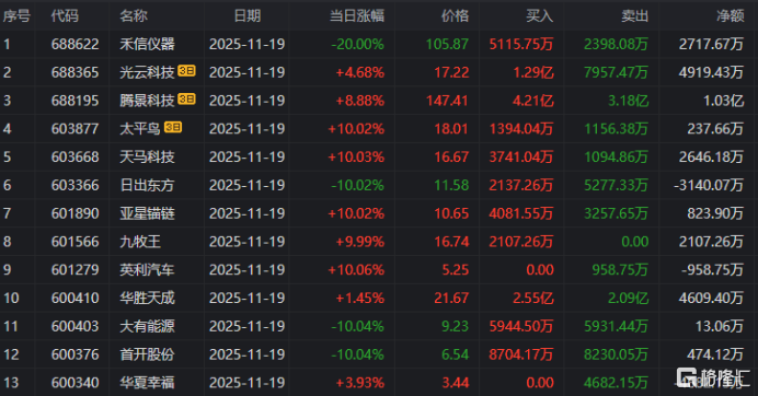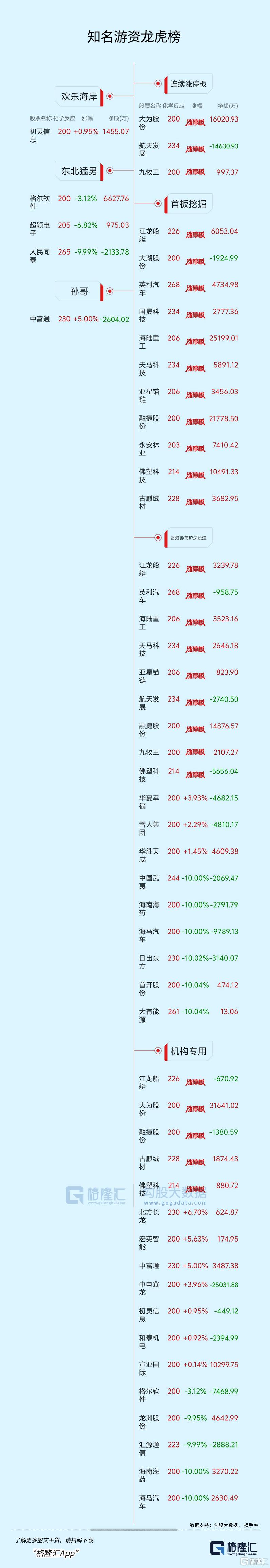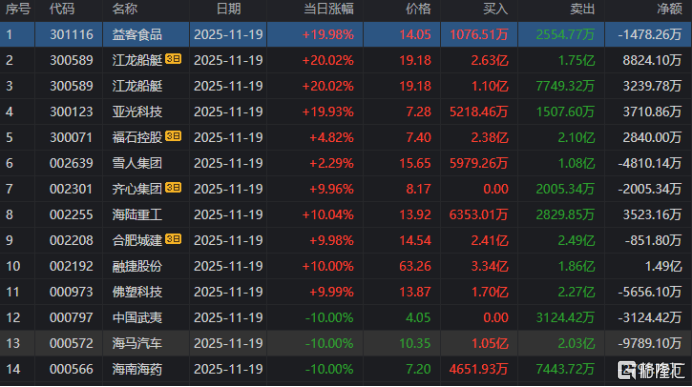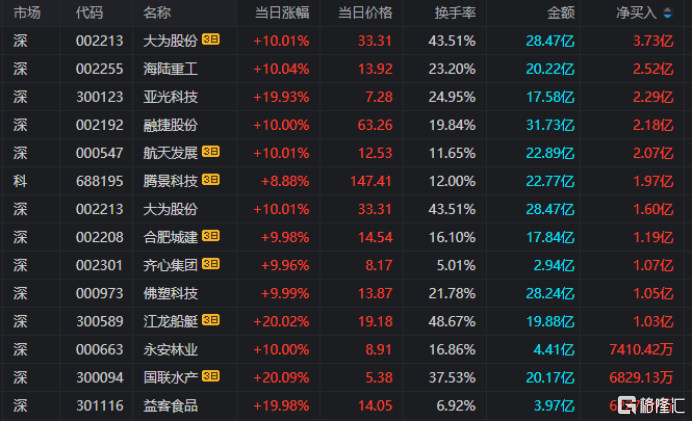 龙虎榜单日净买入额前三为海陆重工、亚光科技、融捷股份,分别为2.52亿元、2.29亿元、2.18亿元。
