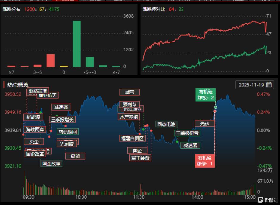 11月19日,A股三大指数小幅震荡,沪指、创业板指均收红。截至收盘,沪指涨0.18%报3946点,深证成指平收,创业板指涨0.25%。全市场成交额1.74万亿元,近4200股下跌。军工、船舶制造、水产养殖、海洋经济板块走高。海南板块、燃气、影视院线等板块跌幅居前。