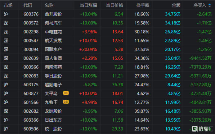龙虎榜单日净卖出额前三为首开股份、海马汽车、中电鑫龙,分别为2.64亿元、1.76亿元、1.47亿元。