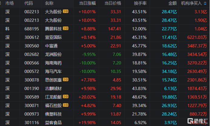 龙虎榜中涉及机构专用席位的个股中,单日净买入额前三为大为股份、宣亚国际、中富通,分别为1.90亿元、6221.03万元、3487.37万元。