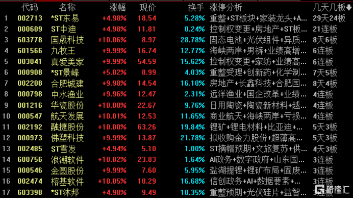 高位股方面,*ST东易29天24板,ST中迪21连扳,九牧王、真爱美家6连板,国晟科技4连板,中水渔业4连板,浪潮软件、洛凯股份、榕基软件3连板。