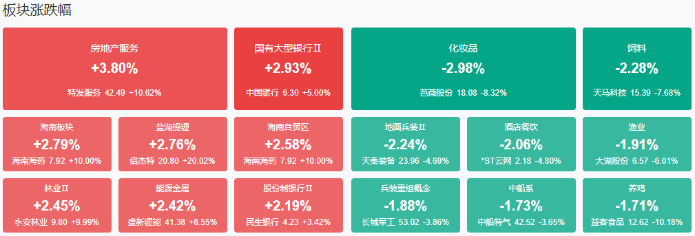 板块方面,能源金属、海南、银行等板块涨幅居前,美容护理、旅游及酒店、食品加工等板块跌幅居前。截至收盘,沪指涨0.38%,深成指跌0.05%,创业板指跌0.52%。