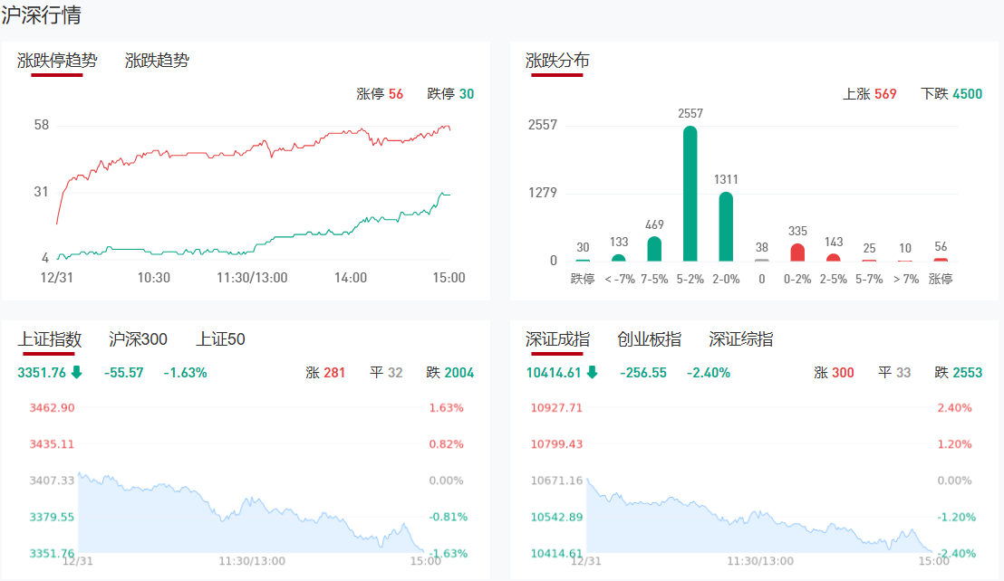 2024年最后一个交易日三大指数集体收跌,截至收盘,沪指跌1.63%,年内累涨12.67%;深成指跌2.4%,年内累涨9.34%;创业板指跌2.93%,年内累涨13.23%;北证50指数跌0.8%,年内累跌4.14%。全市场成交额13586亿元,较上日放量701亿元。全市场超4600只个股下跌。