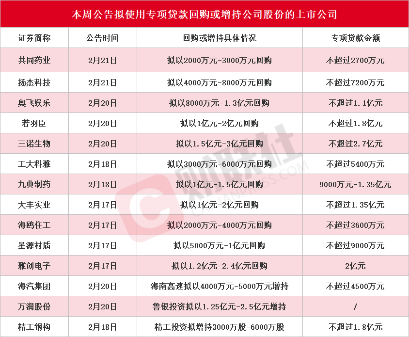 获得回购增持专项贷款支持的A股上市公司持续扩容。据财联社不完全统计,截至发稿,本周(2月17日-2月22日)包括共同药业、扬杰科技、奥飞娱乐、若羽臣、三诺生物、工大科雅、九典制药、大丰实业、海鸥住工、星源材质、雅创电子、海汽集团、万润股份和精工钢构在内的14家上市公司披露回购增持再贷款相关情况。具体情况如下图: