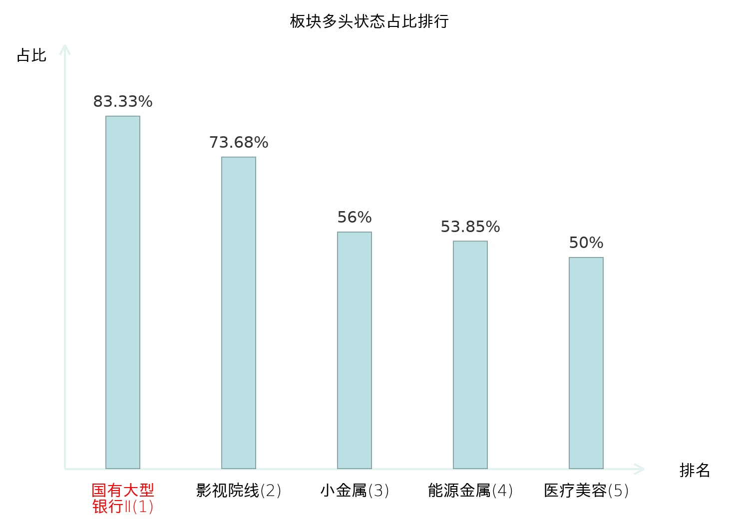 全市场所有行业板块中主力多头状态占比排名中,国有大型银行Ⅱ板块位居第一。电视广播Ⅱ板块名次提升最快,较昨日上升99位。
