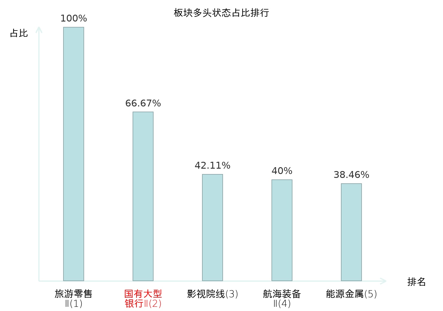全市场所有行业板块中主力多头状态占比排名中,旅游零售Ⅱ板块位居第一。林业Ⅱ板块名次提升最快,较昨日上升102位。