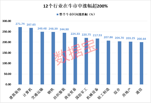 在2014年-2015年这轮牛市中,申万28个行业有27个行业指数实现了翻倍上涨,12个行业指数累计涨幅超200%,银行板块指数是唯一一个未实现翻倍增长的板块,累计涨幅为96.78%。不过纵观行业表现可以看出,银行和非银金融板块是此轮牛市中最先集体爆发的板块,对大盘后期的上涨以及市场的交易情绪起到推波助澜作用。