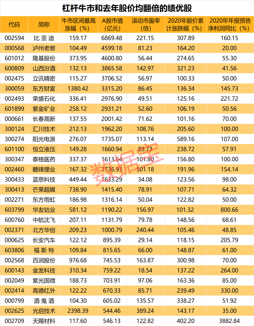 不过,当年2500多只翻倍股中,有1381只股在2020年股价累计实现正增长,其中有159只股2020年全年涨幅超过100%。