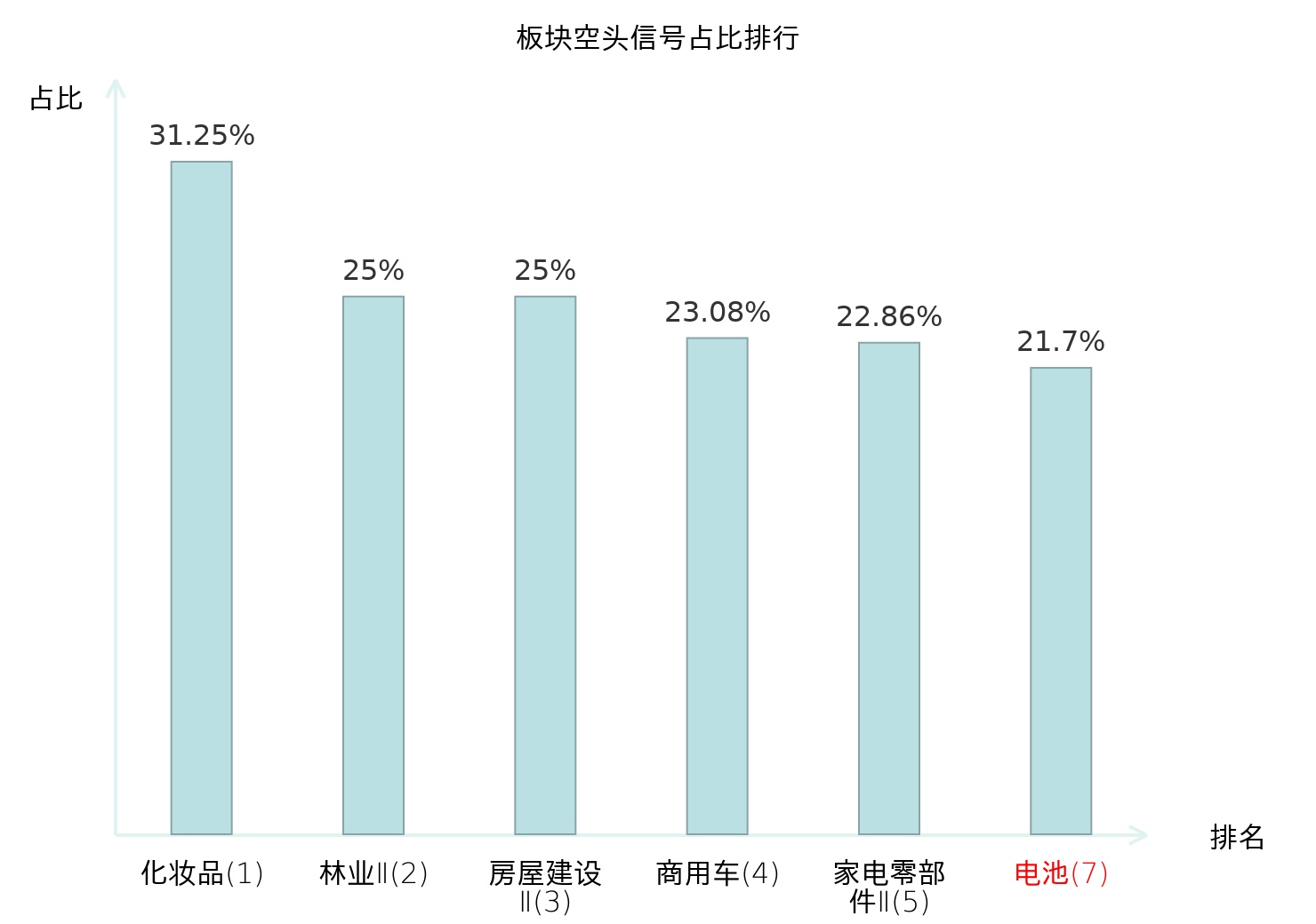 全市场所有行业板块中主力空头信号占比排名中,化妆品板块位居第一。房屋建设Ⅱ板块名次提升最快,较昨日上升113位。