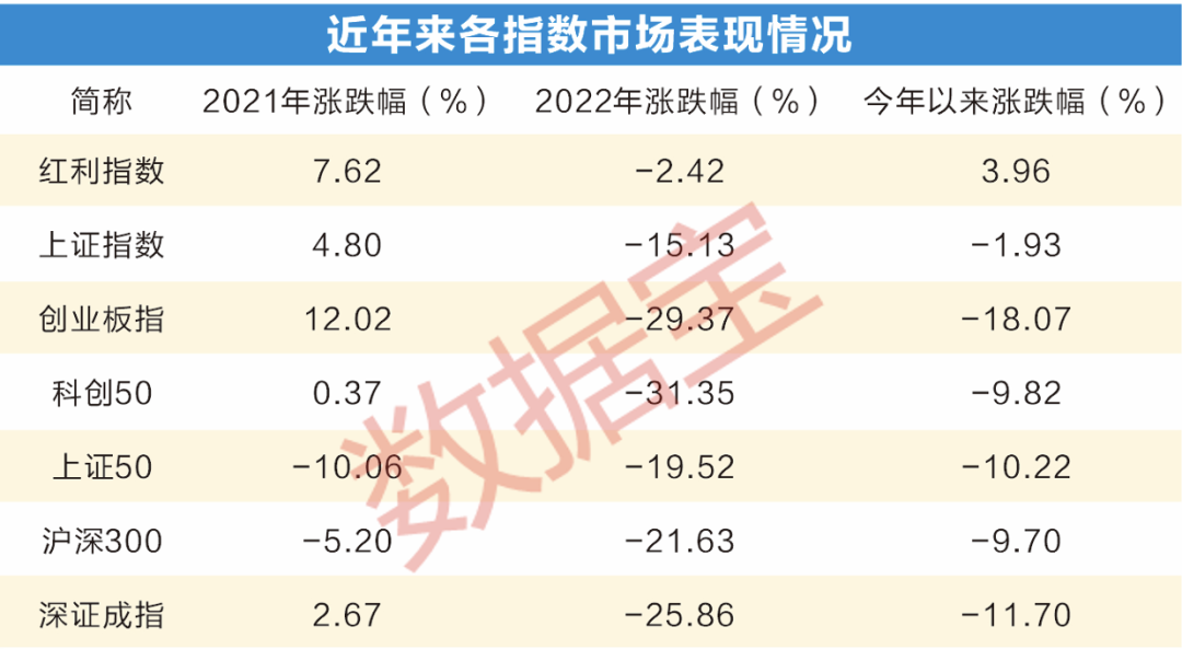 今年以来A股表现弱势,各主要指数均出现回调,创业板指大跌逾18%,创出多年来新低。不过,作为高股息率个股的代表,红利指数的表现却相当亮眼,年内逆市上涨3.96%。往前看,红利指数2022年小幅下跌2.42%,2021年上涨7.62%,表现持续跑赢上证指数。