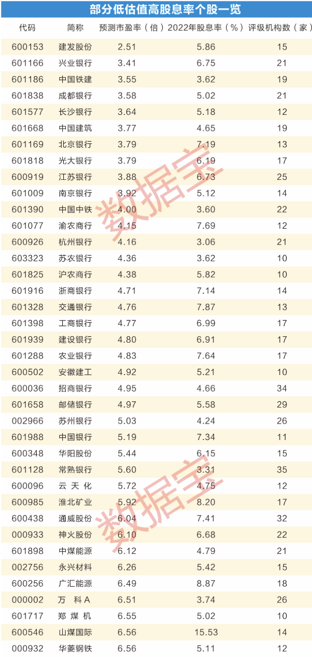 数据宝梳理了机构关注度较高的低估值价值股,统计条件如下:10家以上机构评级、去年底股息率在3%以上且按照机构一致预测今年净利计算的市盈率在10倍以下,合计共有72股。其中,建发股份、兴业银行、中国铁建、成都银行、长沙银行等个股今年预测市盈率均不足4倍。