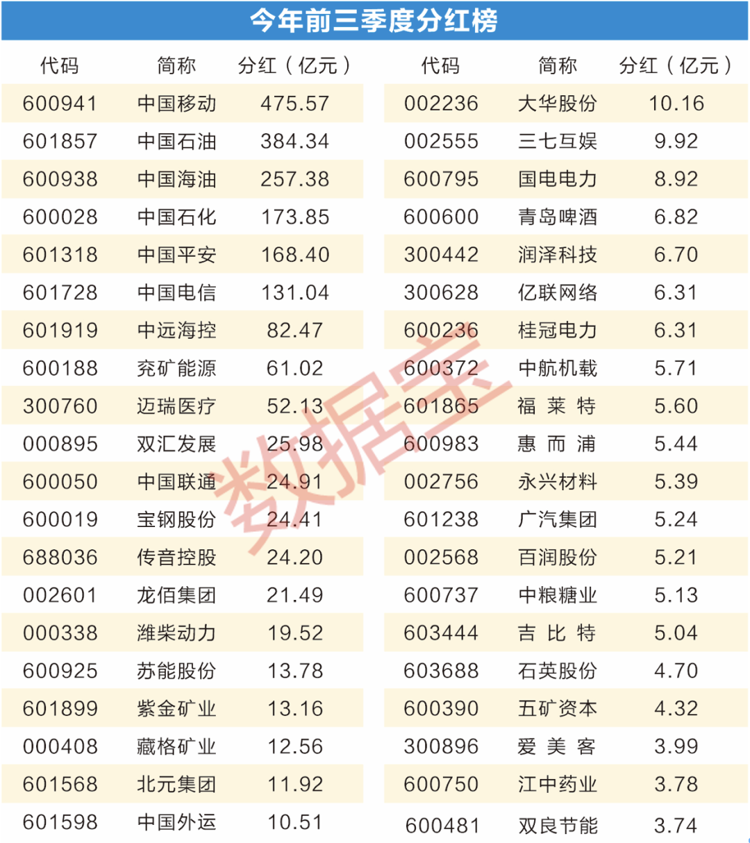 民企方面,迈瑞医疗三季报大举分红逾52亿元,双汇发展、传音控股、龙佰集团等公司均分红超20亿元。