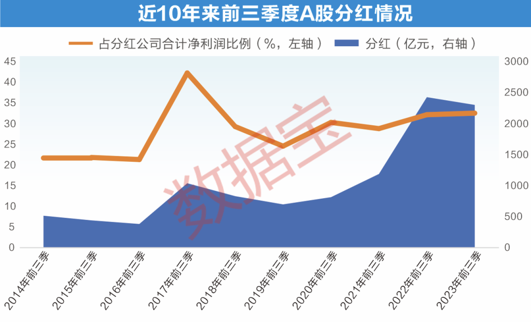 今年前三季度多达243家公司现金分红(所有统计数据只包含各个报告期分红,不包含特别分红),派现公司数量及占比均创出10年来同期新高;合计分红近2300亿元,分红率接近33%,分红额及分红率均为近10年来同期次高。
