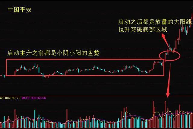 比如上图是17年中国平安主升浪启动前走势,启动前K线小阴小阳排列,走势上处于一个震荡盘整阶段,而进入主升浪之后,股价进入急速拉升阶段,不断拉出大阳线。