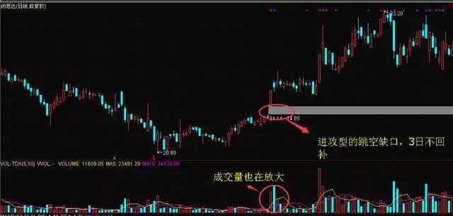 2、出现向上跳空缺口不回补,这里的不回补一般是指3个交易日内。