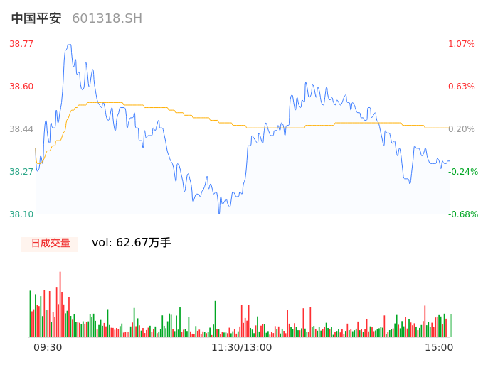04月16日,中国平安收报38.28,股价涨幅-0.21%,成交金额24.09亿元,换手率0.58%。
