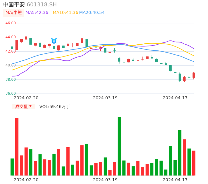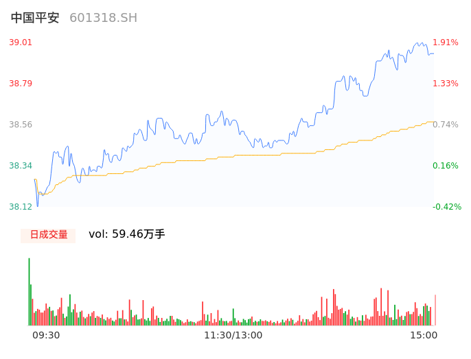 04月17日,中国平安收报38.95,股价涨幅1.75%,成交金额22.94亿元,换手率0.55%。