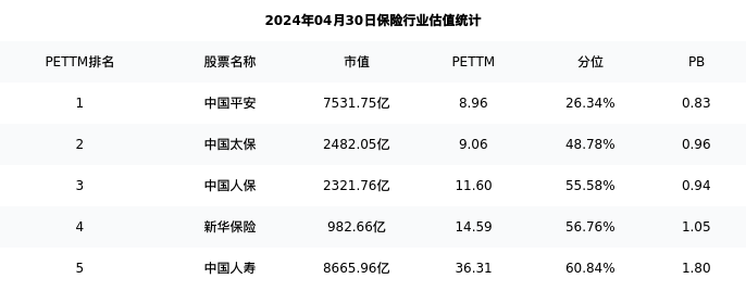 从估值角度看:中国平安最新市盈率PETTM为8.96,在行业内排名1/6,处于26.34分位。