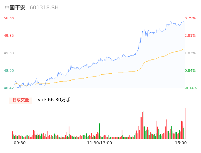 09月22日,中国平安收报50.33,股价涨幅3.79%,成交金额32.82亿元,换手率0.62%。