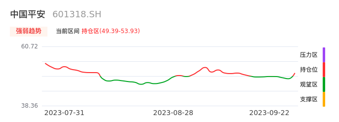 我们来看一下该股的九方特色指标强弱趋势的情况:中国平安近日从观望区上穿到持仓区。股价短期站稳多头区域,上升动能仍较为充足,可积极关注。后续重点关注上方压力位:53.93元是否能突破上攻。