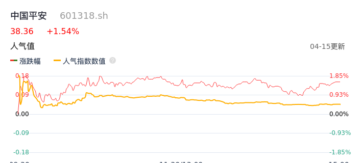 04月15日,中国平安收报38.36,股价涨幅1.54%,成交金额29.54亿元,换手率0.72%。