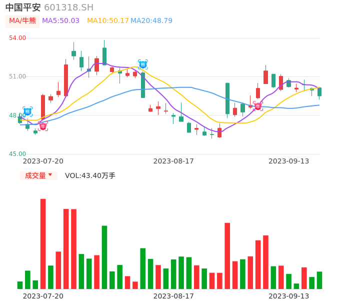 09月13日,中国平安收报49.50,股价涨幅-0.90%,成交金额21.52亿元,换手率0.40%。