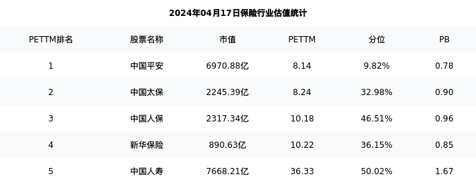 从估值角度看:中国平安最新市盈率PETTM为8.14,在行业内排名1/6,处于9.82分位。