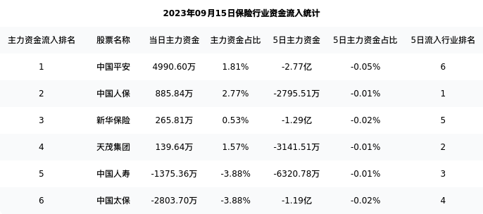中国平安今日净流入4990.60万元,主力占比1.81%,在行业内排名:1/6;5日净流出2.77亿元,主力占比0.05%,在行业内排名:6/6。