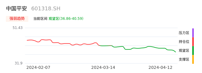 我们来看一下该股的九方特色指标强弱趋势的情况:中国平安自03月14日从持仓区下穿到观望区,股价近期持续走弱。短期已经进入空头行情,且下跌动能仍未衰竭。建议继续谨慎观望。