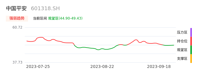 我们来看一下该股的九方特色指标强弱趋势的情况:中国平安自09月13日从持仓区下穿到观望区。股价近期持续下跌后,短期出现止跌迹象。后续重点关注能否再次站上多空分界点:49.43元。如未能有效突破则可能进入新一轮空头行情。
