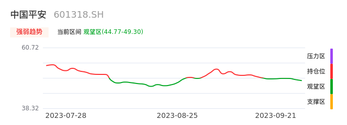 我们来看一下该股的九方特色指标强弱趋势的情况:中国平安自09月13日从持仓区下穿到观望区,股价近期持续走弱。短期已经进入空头行情,且下跌动能仍未衰竭。建议继续谨慎观望。