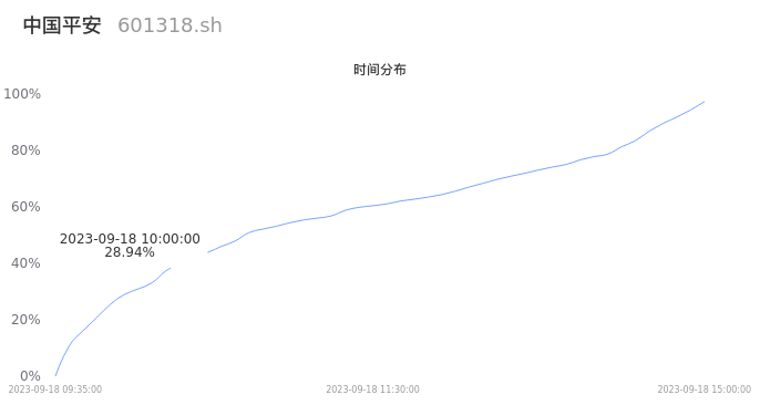 601318中国平安2023年09月18日成交29.53万手,成交金额14.52亿元,相较昨日缩量26.23万手,换手率0.27%,成交清淡。