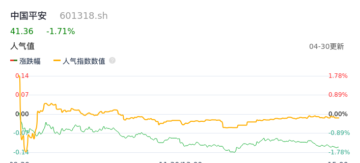 04月30日,中国平安收报41.36,股价涨幅-1.71%,成交金额21.57亿元,换手率0.48%。