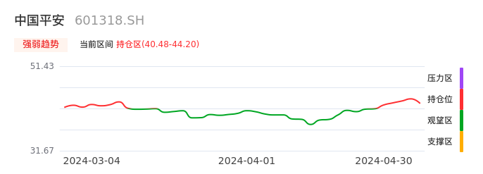 我们来看一下该股的九方特色指标强弱趋势的情况:中国平安自04月24日从观望区上穿到持仓区。股价近期在多头区域回调整理。后续重点关注多空分界点的争夺:40.48元。如未能有效站稳则可能重新回到空头行情。