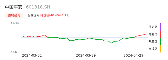 我们来看一下该股的九方特色指标强弱趋势的情况:中国平安自04月24日从观望区上穿到持仓区。股价近期在多头区域持续强势上扬,上升动能仍较为充足,可积极关注。后续重点关注上方压力位:44.11元是否能突破上攻。