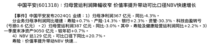 值得注意的是:2024年04月海通证券的孙婷/曹锟分析师,首次发布关于中国平安的研究报告,标题为:中国平安(601318):归母营运利润降幅收窄 价值率提升带动可比口径NBV快速增长。